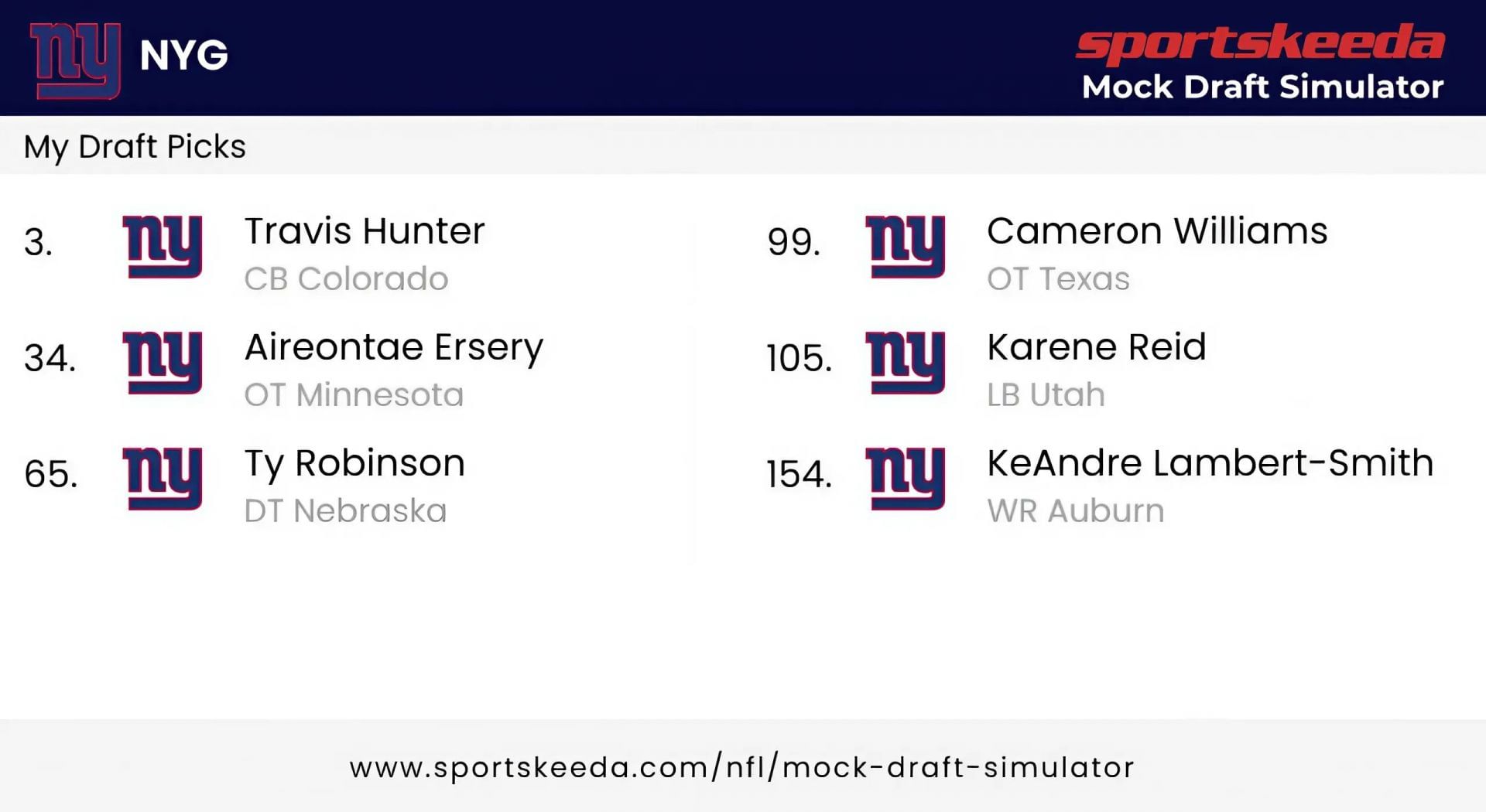 What the New York Giants do at pick No. 3 is one of the biggest questions heading into the NFL draft. Quarterback Cam Ward is likely to be the first overall pick to the Tennessee Titans if all indications are correct. This leaves at least either Penn State pass rusher or cornerback Travis Hunter available at this pick, and in this simulation, it is the cornerback-wide receiver hybrid Travis Hunter who the Giants select.