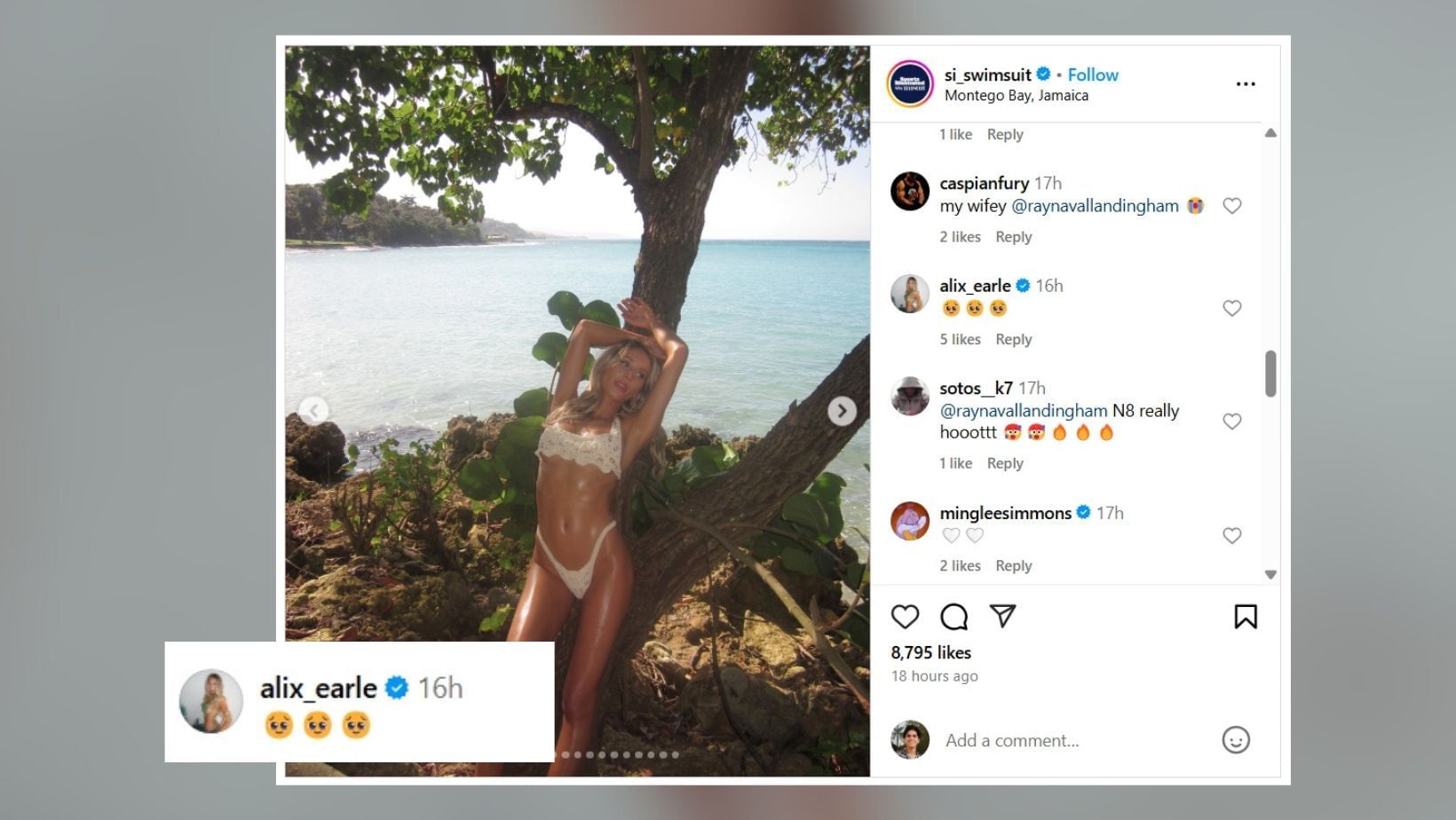 SI also shared an Instagram post featuring the BTS moments from photoshoots of multiple models, including Earle. The sixth slide was Earle's picture where she posed on a tree, with the sea in the background.