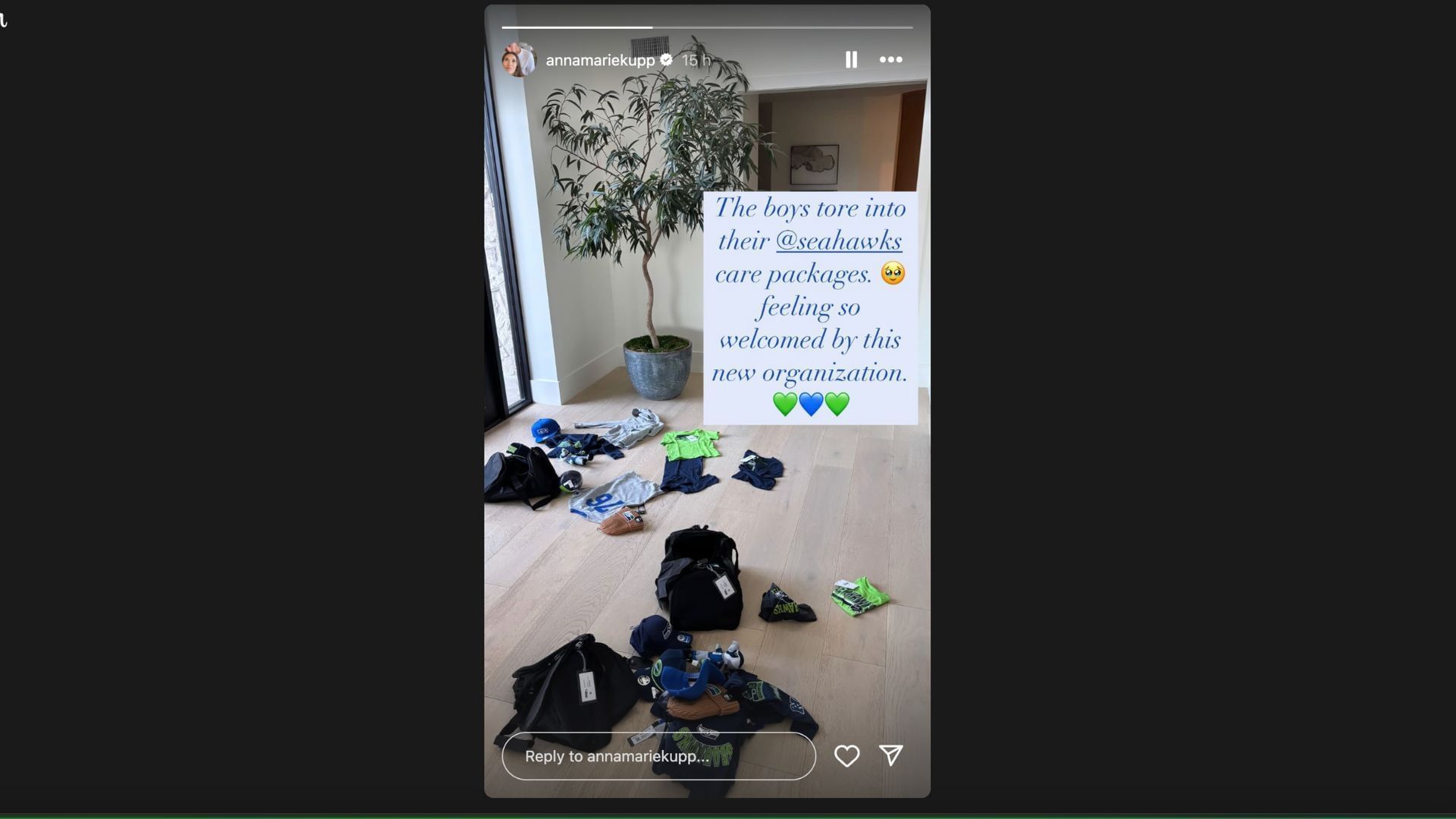 Anna Marie posted an Instagram story featuring care packages from the Seahawks that had been opened possibly by the couple's children. The photo featured opened boxes with team swag littering the floor.