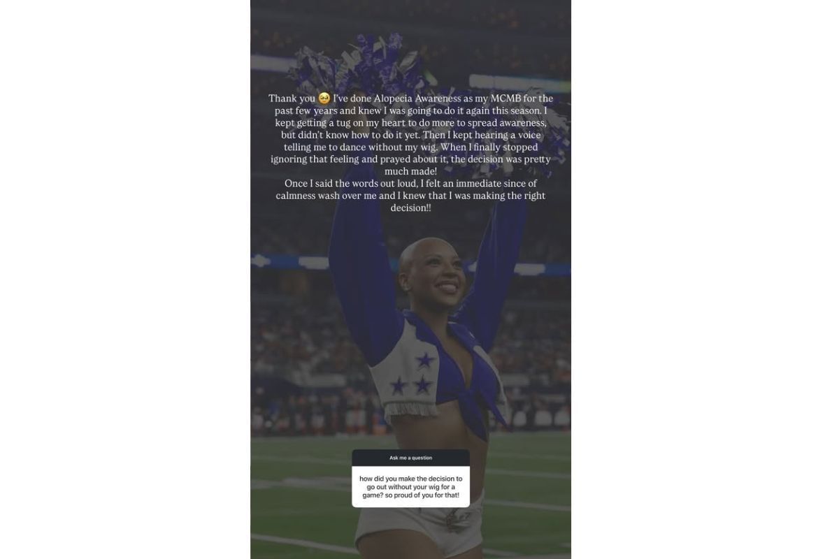 The Cowboys cheerleader described how her hair loss progressed through adolescence and into college. She used sew-in extensions and wigs to manage her appearance while pursuing dance and her cheerleading job.