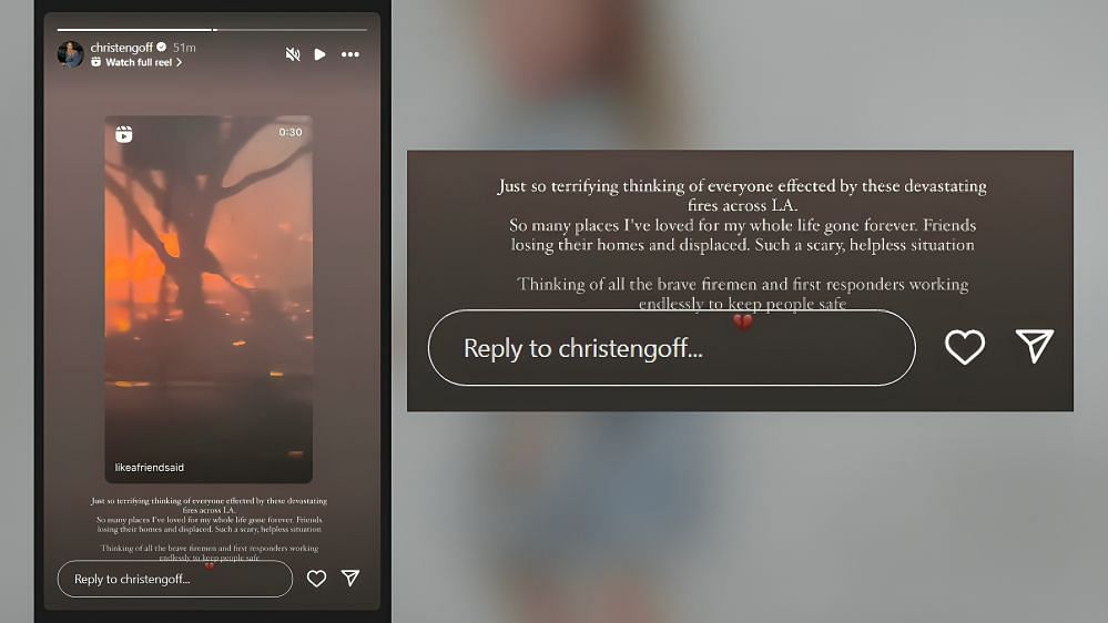 On Wednesday, Jared Goff's wife Christen took to her Instagram story to express her reaction to the ongoing fire in Los Angeles. Sharing a reel featuring a clip of the fire, Christen wrote: