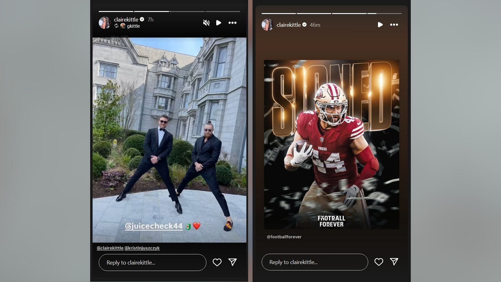 Claire shared George's Instagram story, showing a photo of the tight end and fullback with Eminem's "Cold Wind Blows" playing in the background. She followed it with another Instagram story highlighting news of Juszczyk's re-signing.