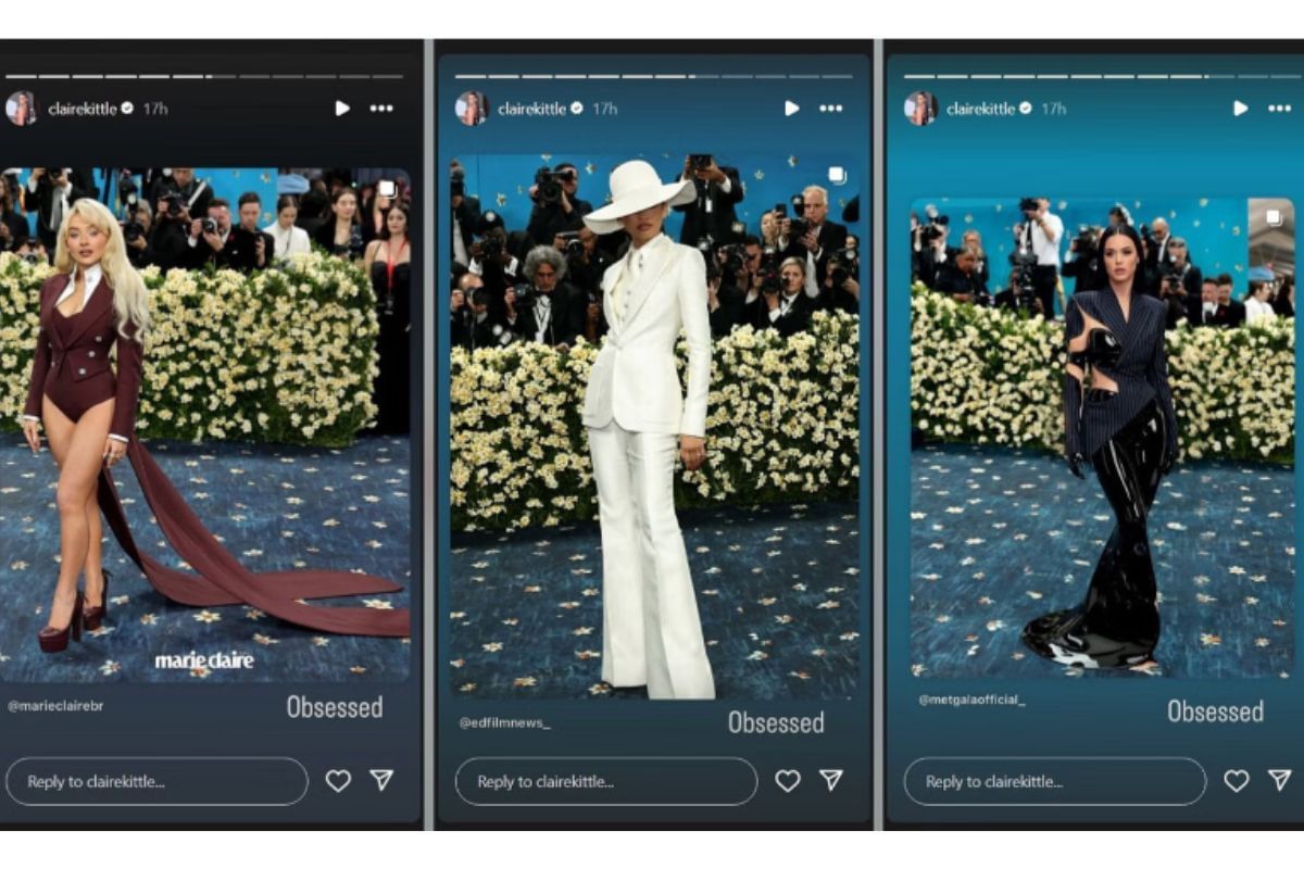 Claire Kittle shared her favorite Met Gala looks on Instagram Stories. She reposted photos of Zendaya, Katy Perry and Sabrina Carpenter, adding one word to sum it all up: “Obsessed.”