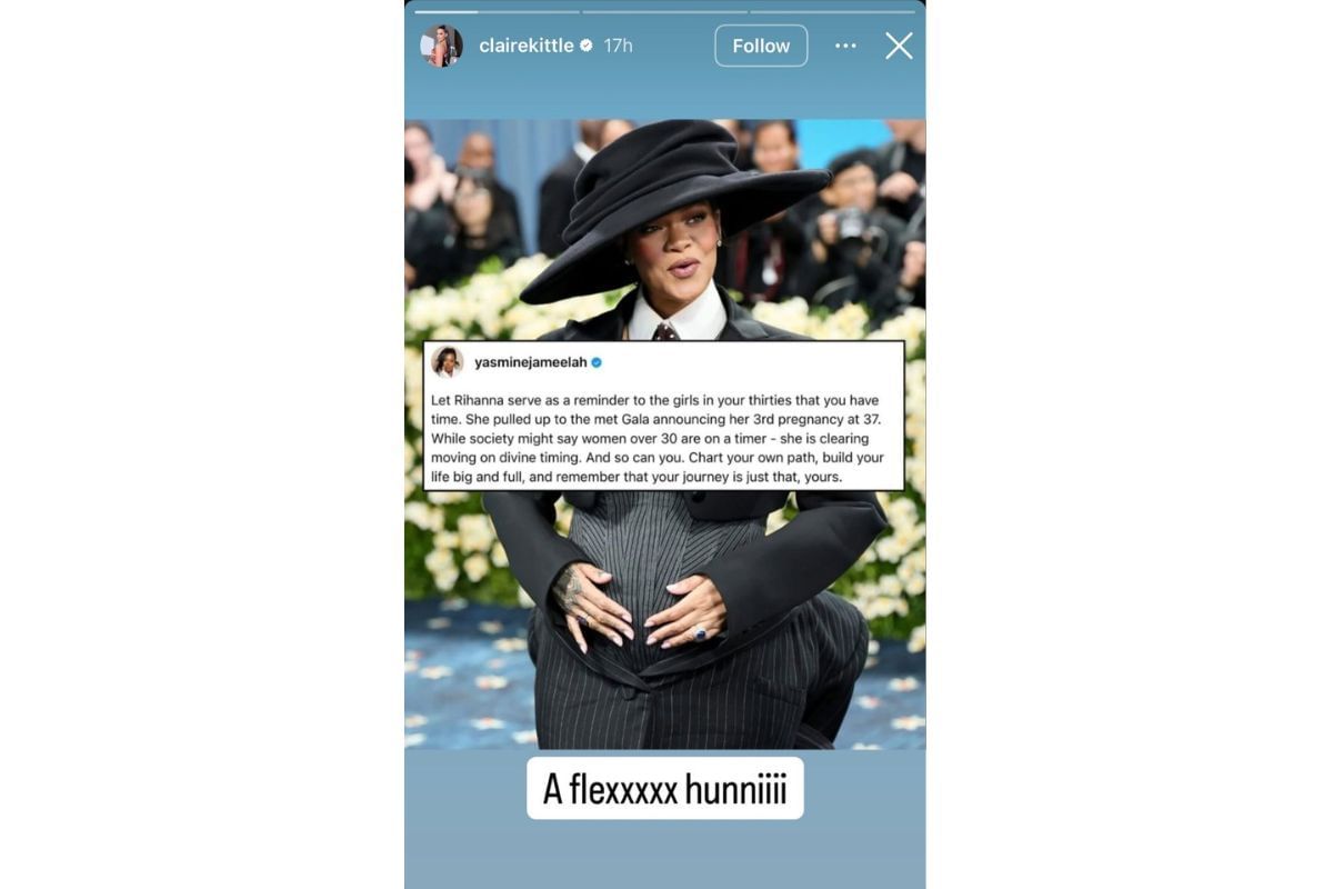 San Francisco 49ers tight end George Kittle’s wife, Claire Kittle, reacted to Rihanna’s third pregnancy announcement at the 2025 Met Gala. On Thursday, she posted a screenshot to her Instagram Stories showing the “Diamonds” singer in a gray hat, two-piece set, gray socks and pointy heels.