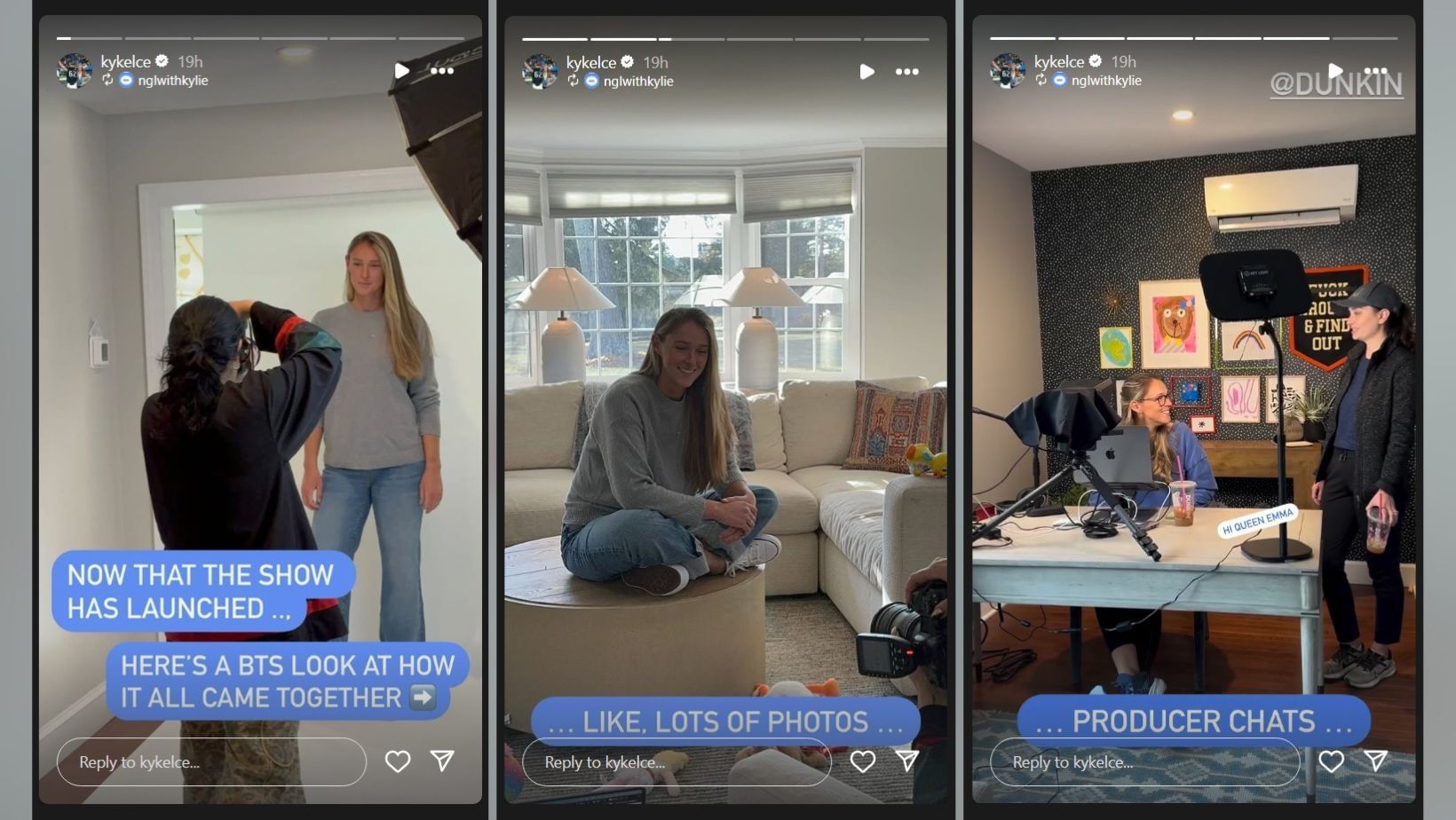 On Friday, Kylie Kelce posted a handful of pictures from the production process of her podcast on her Instagram story. The images included BTS pictures of Kylie from the podcast cover shoot, as well as clips featuring the producer.