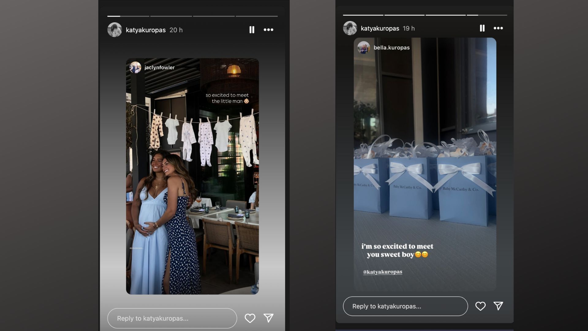One of the images featured Kuropas posing beside a friend, while a clothesline of tiny baby onesies served as a festive backdrop. Another story displayed stacks of wrapped gifts.