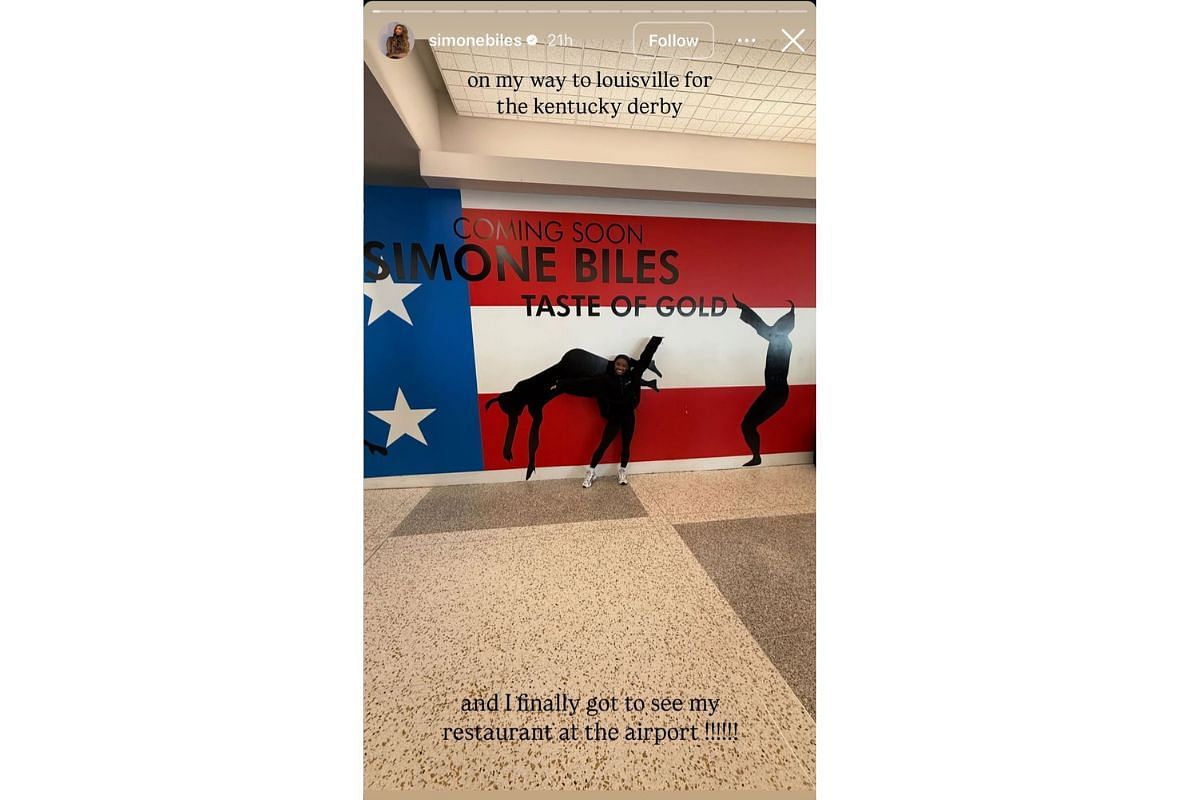 While en route to Louisville for the 151st Kentucky Derby, Biles posted a photo of herself in a black hoodie on her Instagram Story from George Bush Intercontinental Airport in Houston. The picture revealed a wall display tied to her latest business venture.
