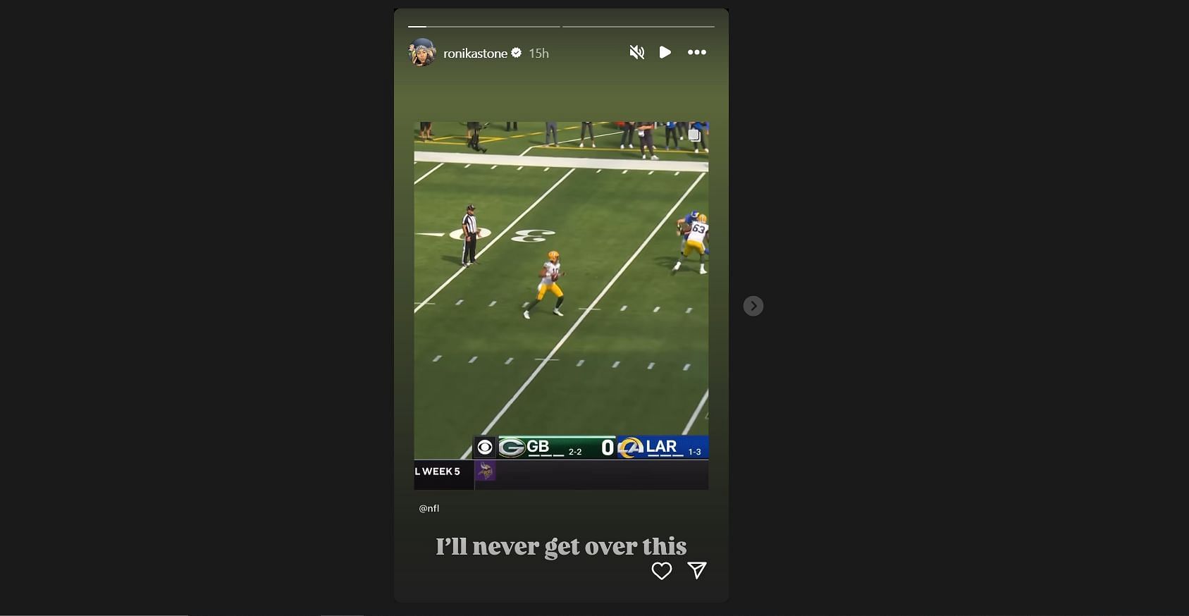However, Jordan Love’s first deep throw in the first quarter of the game won over Ronika Stone, as she shared the video of his throw in an Instagram story. At 2nd and 10, Love dropped deep and threw a 54-yard stunner to wide receiver Jayden Reed, who caught it 1-yard before the touchdown line.