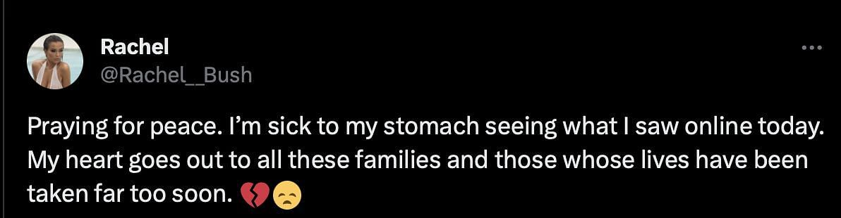 Rachel Bush is often in the spotlight as she is married to NFL defensive back Jordan Poyer. As such, her social media posts can reach hundreds and thousands of people. Bush took to her Twitter (X) account, which has over 100K followers, to comment on a global matter.