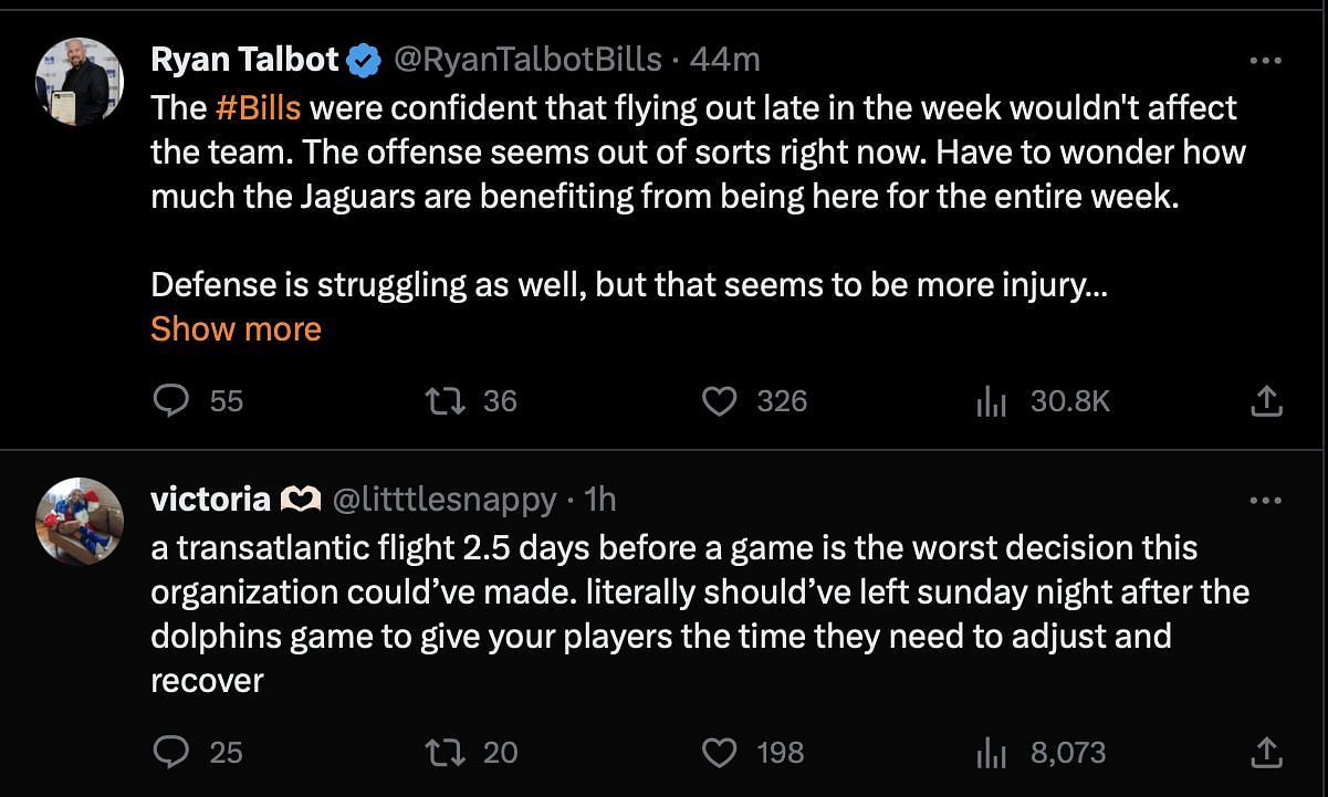 Based on the tweets, it seems that she was concerned that the Bills should've traveled to London after their Week 4 win over the Miami Dolphins. Buffalo last played in the city back in 2015, while the Jaguars have been in London for over a week.