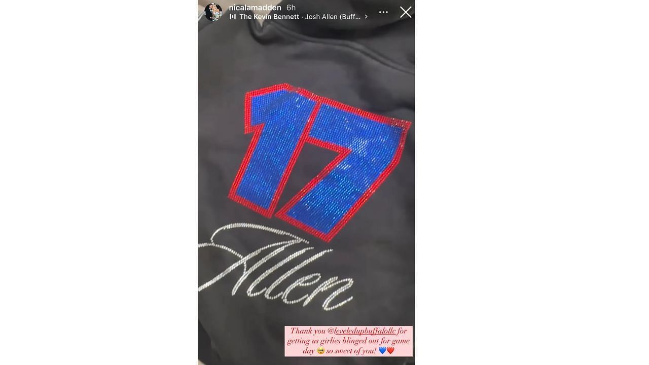 Leveled Up Buffalo is a popular shop for stylish Bills gear. It is loved by both fans and players' families. Nicala Madden’s shiny jacket isn’t their first hit. Bills' Dawson Knox's wife, Alexandra Knox, has also been seen wearing their designs before big games.