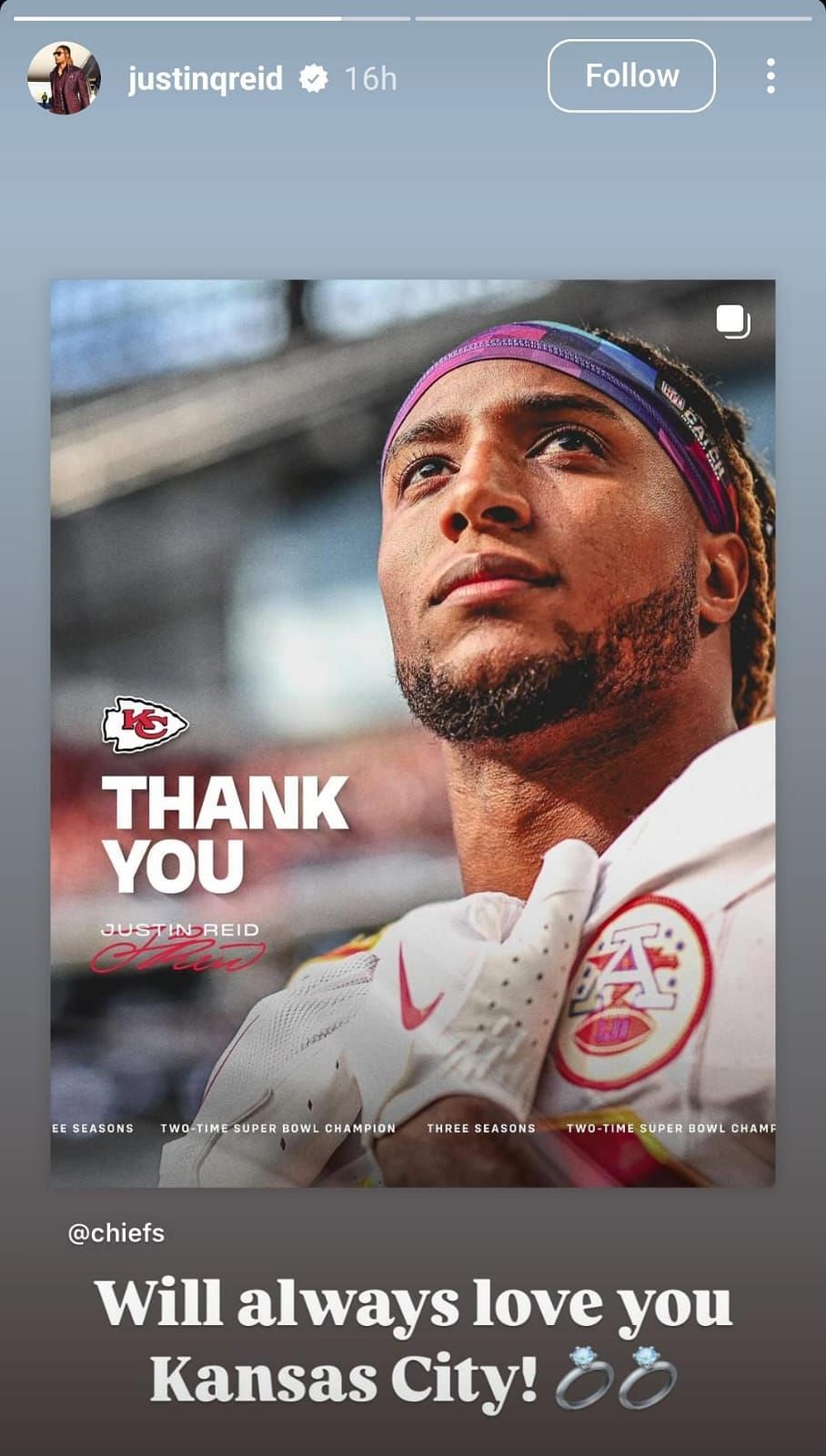 On Sunday, Justin Reid took to social media with an emotional message for the Chiefs. On his Instagram story, he shared a post by the team thanking him for his service. Reid accompanied the story with a heartfelt farewell to the fans and the team.
