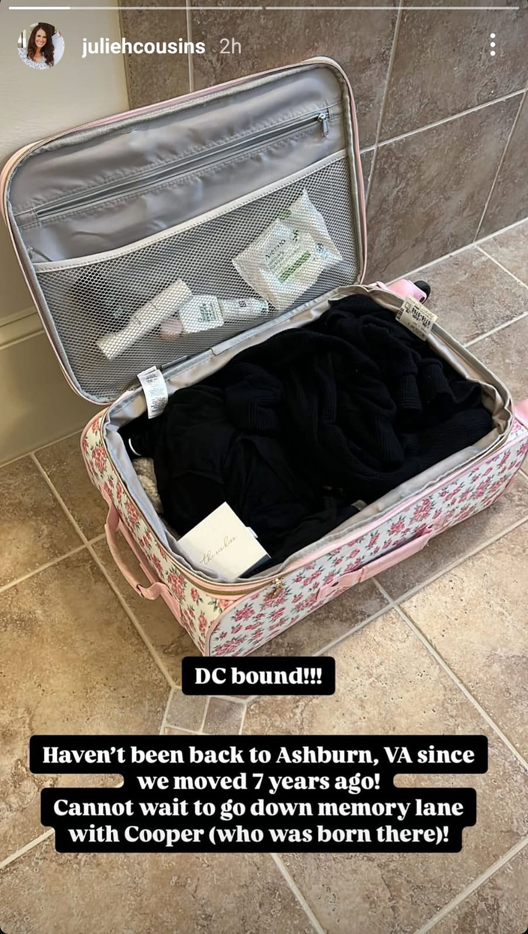 "DC Bound!!! Haven't been back to Ashburn, VA since we moved 7 years ago! Cannot wait to go down memory lane with Cooper (who was born here)."