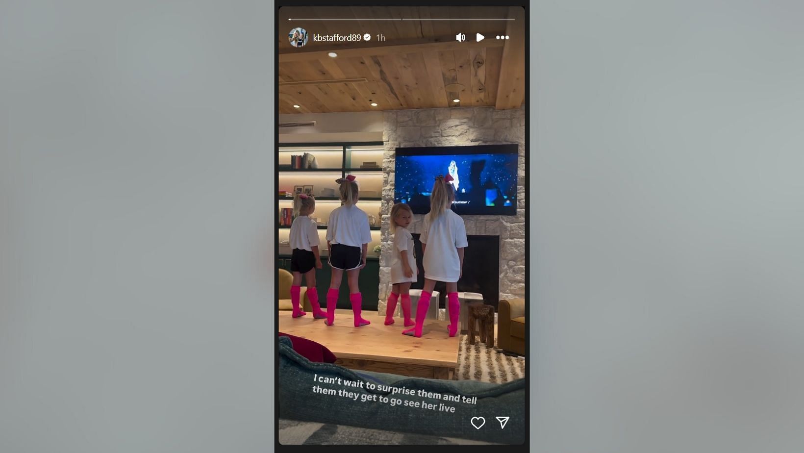On Saturday, Kelly Stafford took to her Instagram to let her followers know what she has planned for her daughters. In the Instagram story, Kelly shared a clip of her kids standing in front of the TV and enjoying Swift's performance, with the caption: