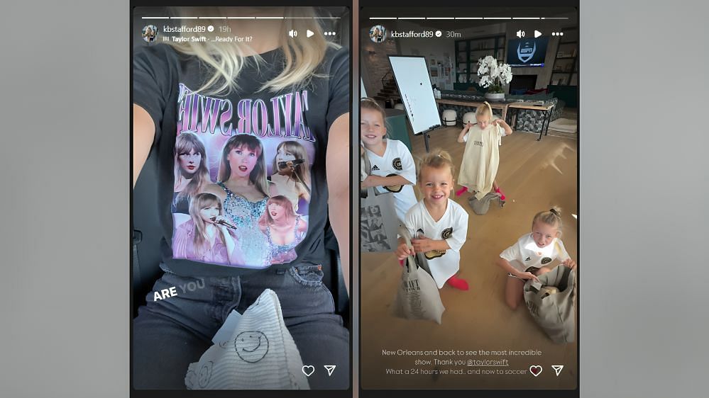 Kelly Stafford's daughters can also be spotted trying out the Eras Tour merchandise they brought from the concert. Before the appreciation message for Taylor Swift, Kelly shared a snapshot of her outfit for the concert. The podcaster adored a Swift merchandise T-shirt.