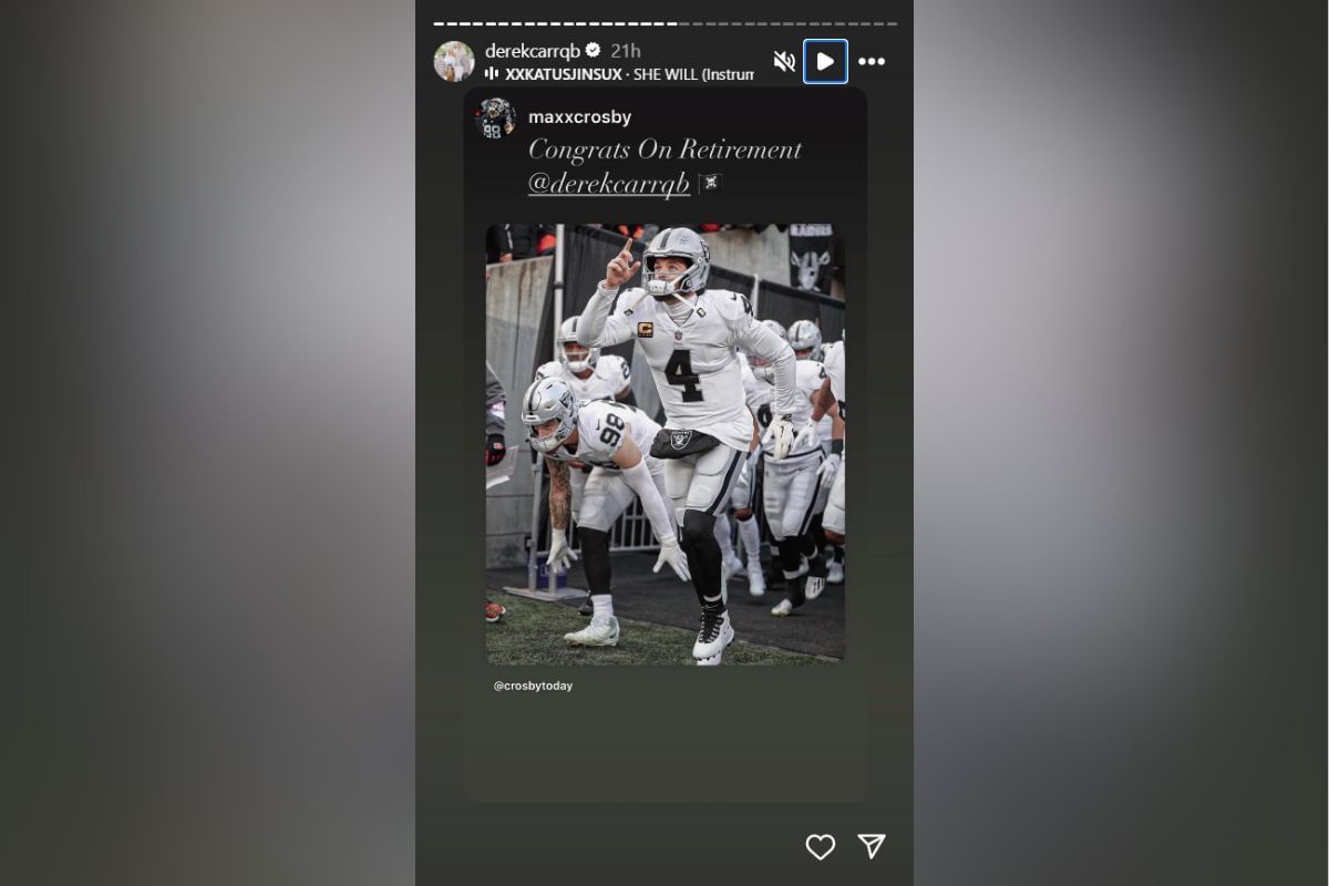 Only hours after Carr's retirement was announced, Las Vegas Raiders defensive end Maxx Crosby posted a special message for the quarterback on his Instagram story. Crosby shared a picture of Carr leading the Raiders onto the field before a game, which the signal-caller reposted on his IG story.