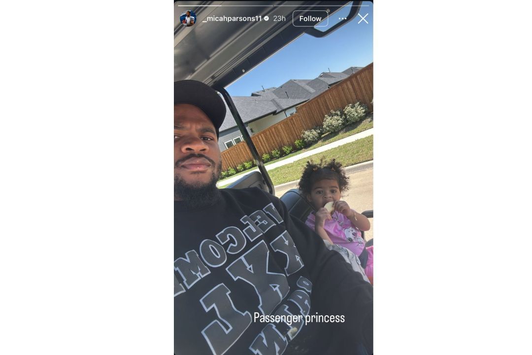 Dallas Cowboys linebacker Micah Parsons offered a personal glimpse into fatherhood via his Instagram story on Wednesday. He shared a photo of his daughter Milana, wearing a pink dress and snacking on a fruit. Parsons added a two-word caption.