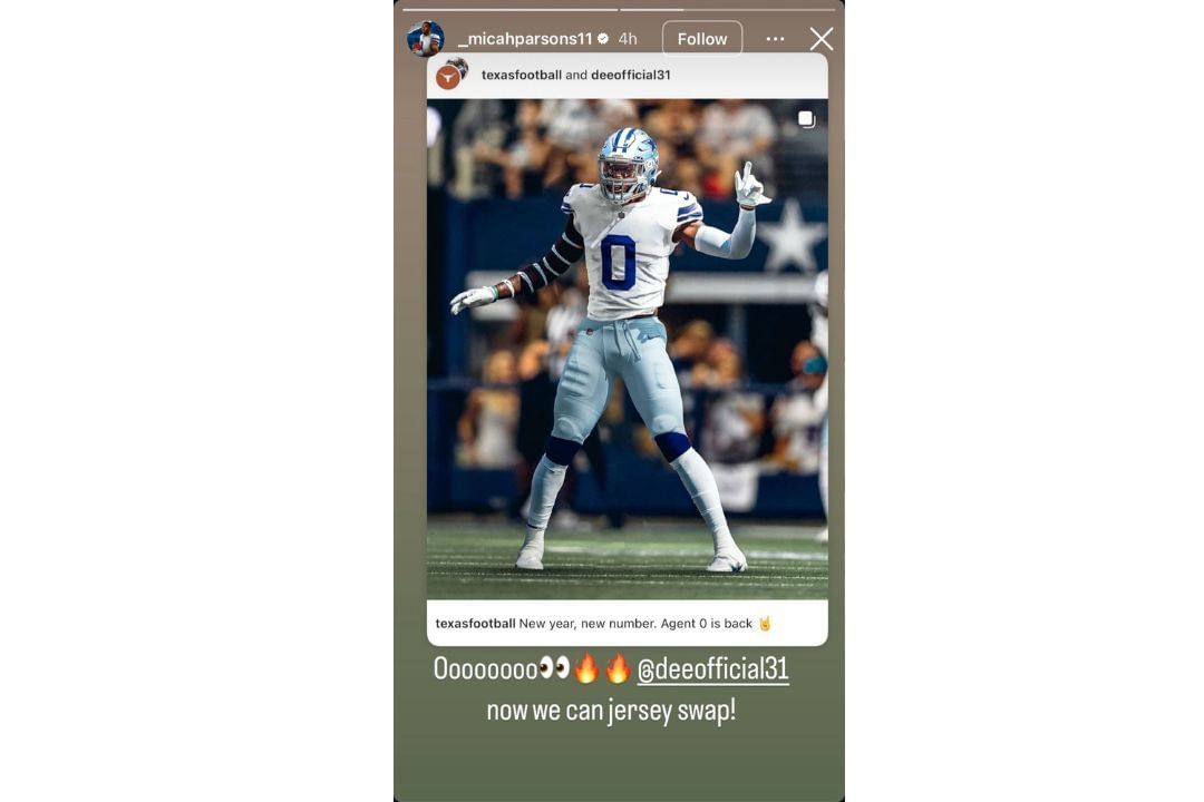 “Oooooo 👀🔥🔥 @deeofficial31 now we can jersey swap!” Parsons captioned.