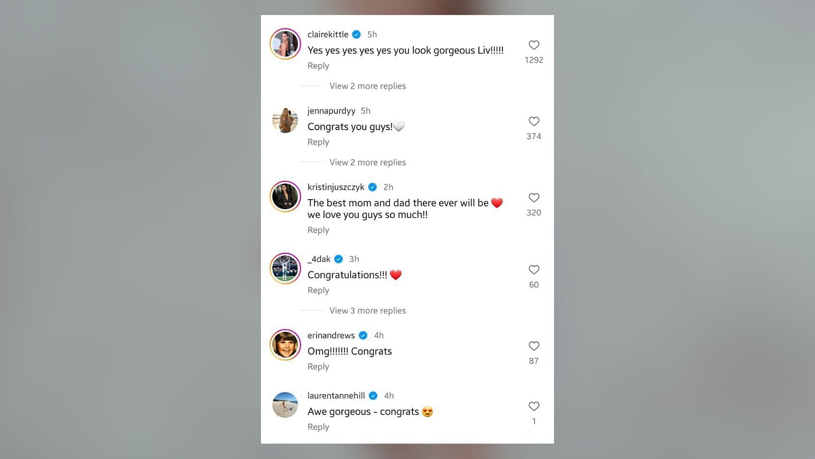 Kyle Juszczyk's wife, Kristin, and Brock Purdy's wife, Jenna, also congratulated the couple on their first pregnancy. Jenna Purdy commented: