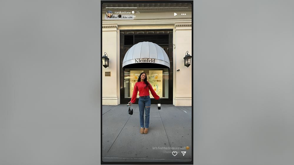 On Thursday, Ronika Stone reshared an Instagram story from her sister Ronna's account. The story featured a picture of Stone posing in front of a Kleinfeld store. The sister-duo visited the store for the volleyball athlete's bridal dress.