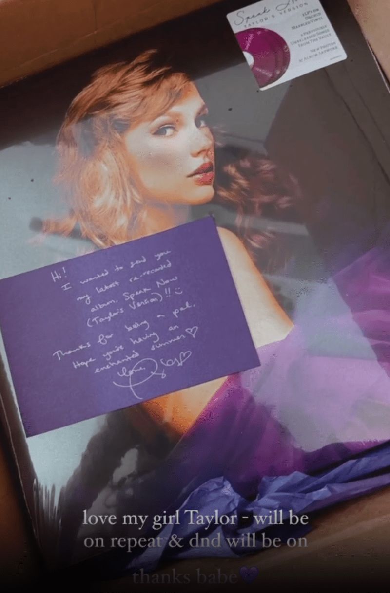 “Hi! I wanted to send you my latest re-recorded album, Speak Now (Taylor’s Version). Thanks for being a pal. Hope you’re having an enchanted summer.”