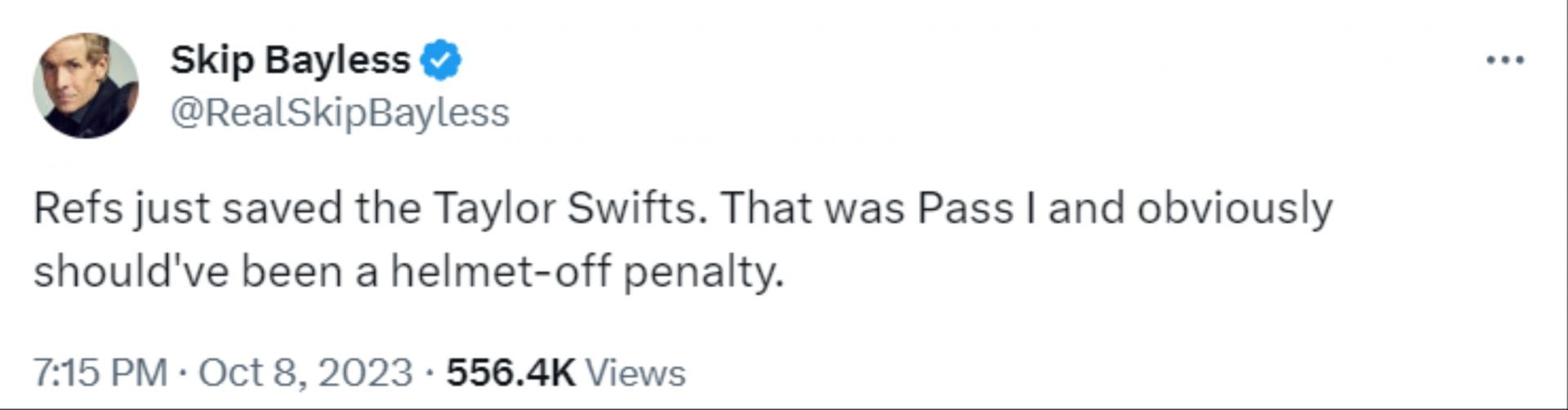 Skip Bayless was furious with the decisions and referenced Taylor Swift, who has been linked to Kansas City star tight end Travis Kelce.