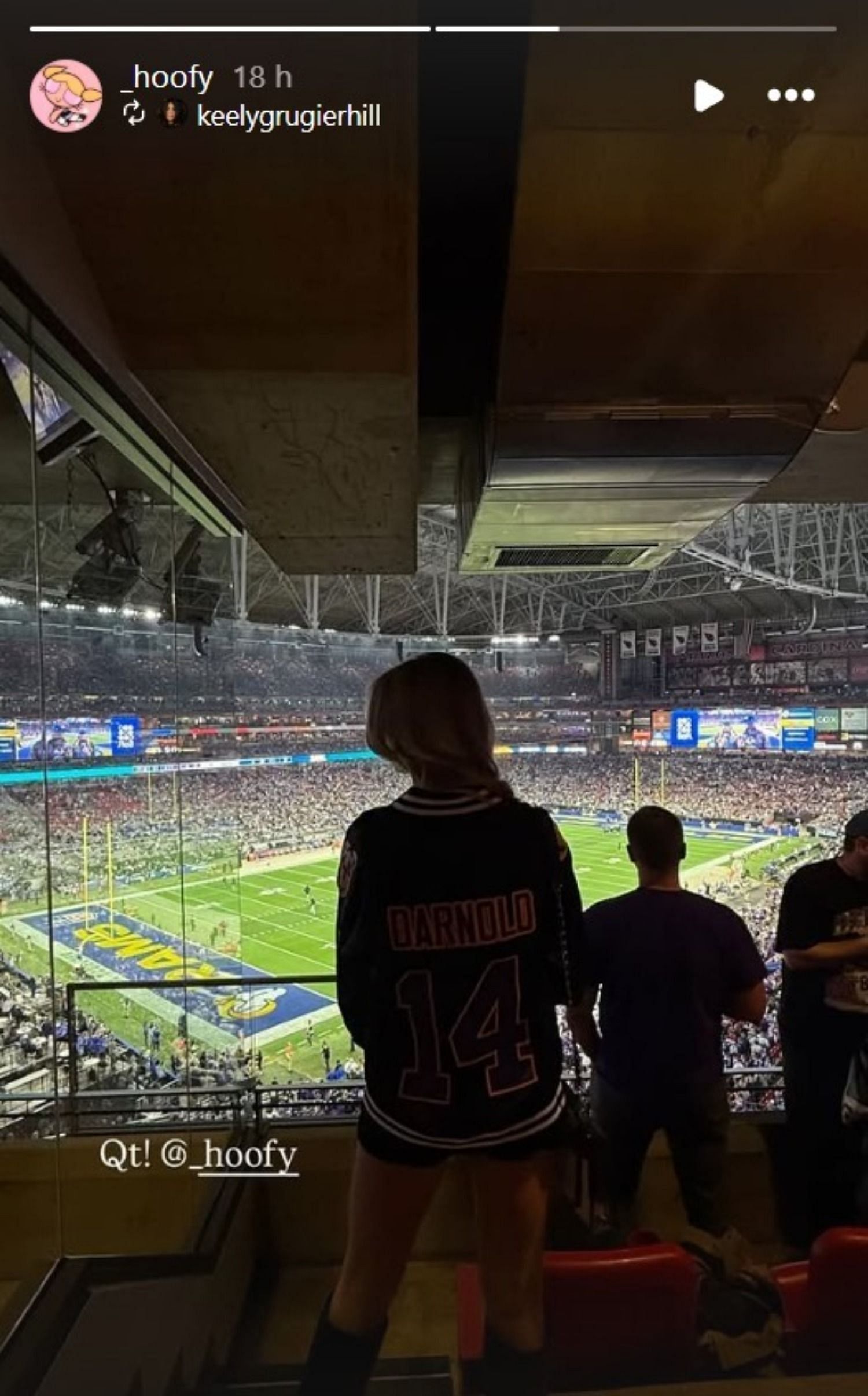 His girlfriend, Katie Hoofnagle, was there to cheer him on. Amid the rout, she shared this story on Instagram of herself wearing a red, white, and black jacket with his name and number 14 on the back: