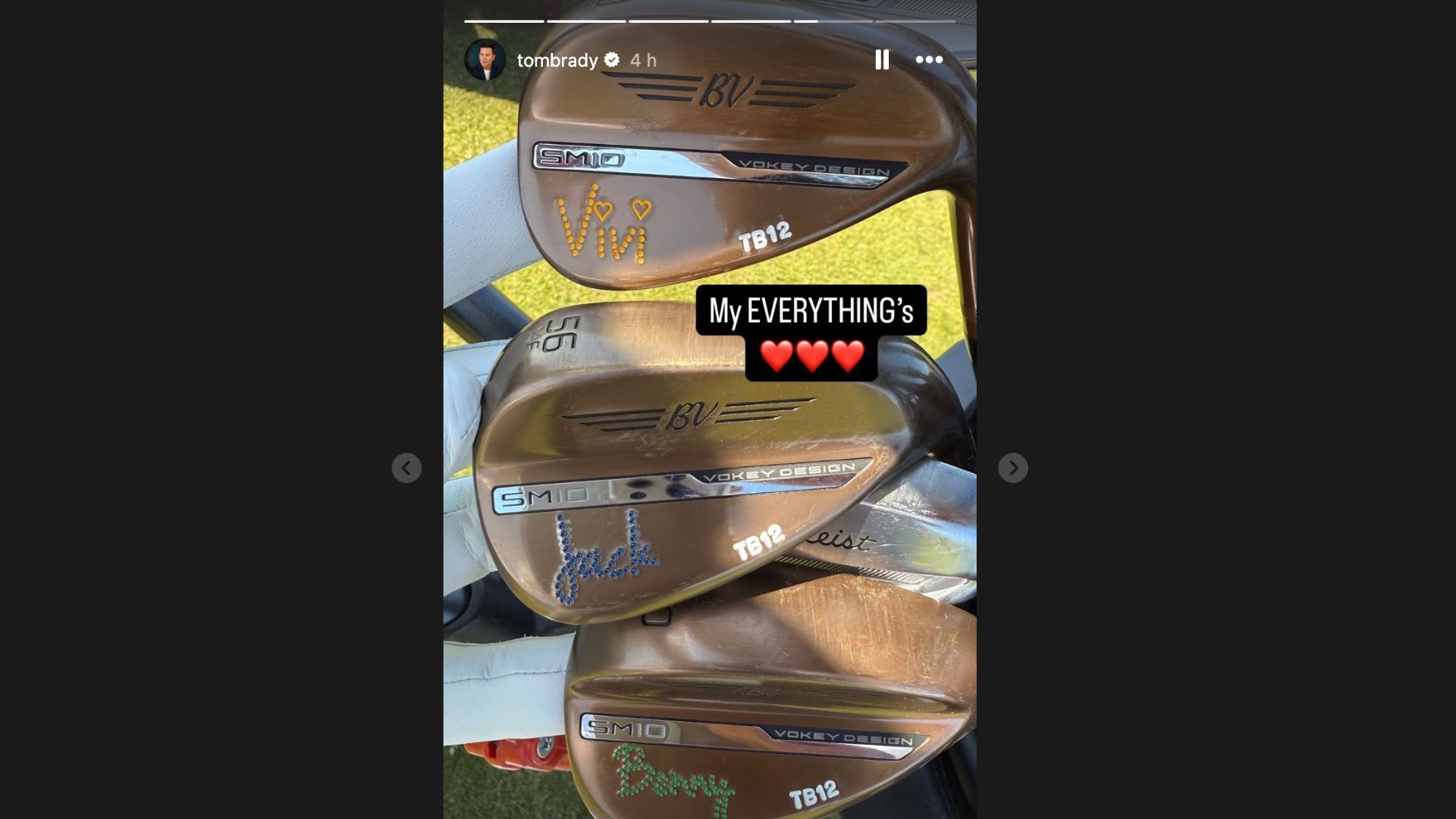 On May 8, 2025, Brady posted an Instagram Story featuring three custom golf clubs with personalized engravings. Each club displayed one of his children's names — "Vivi" in yellow, "Jack" in blue, and "Benny" in green — on remarkable SM10 Vokey Design and TB12 branded golf equipment.