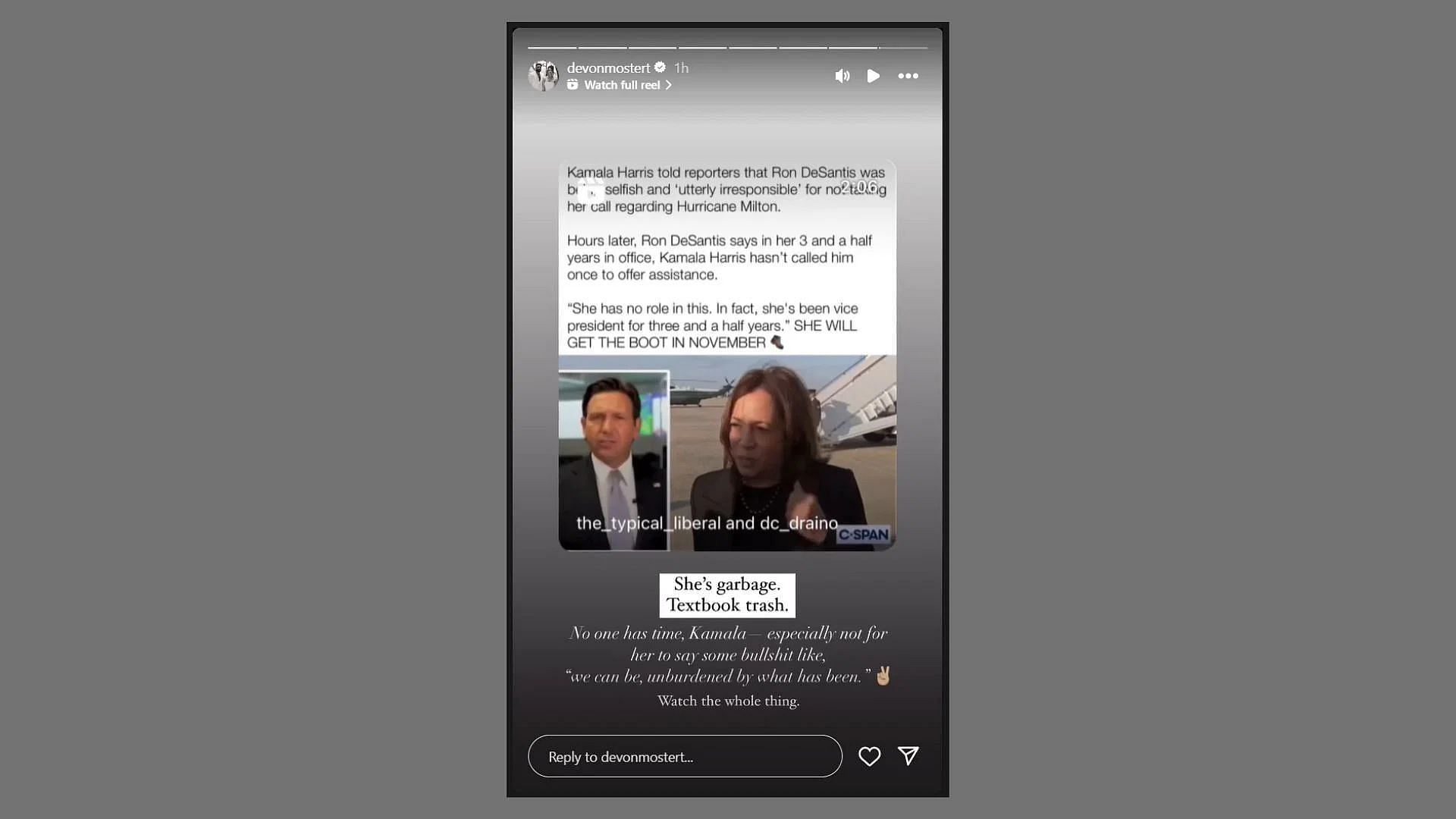 Before speaking to Fox Sports, Devon went to Instagram to call out Kamala Harris. Devon was upset over the vice president, blaming DeSantis.