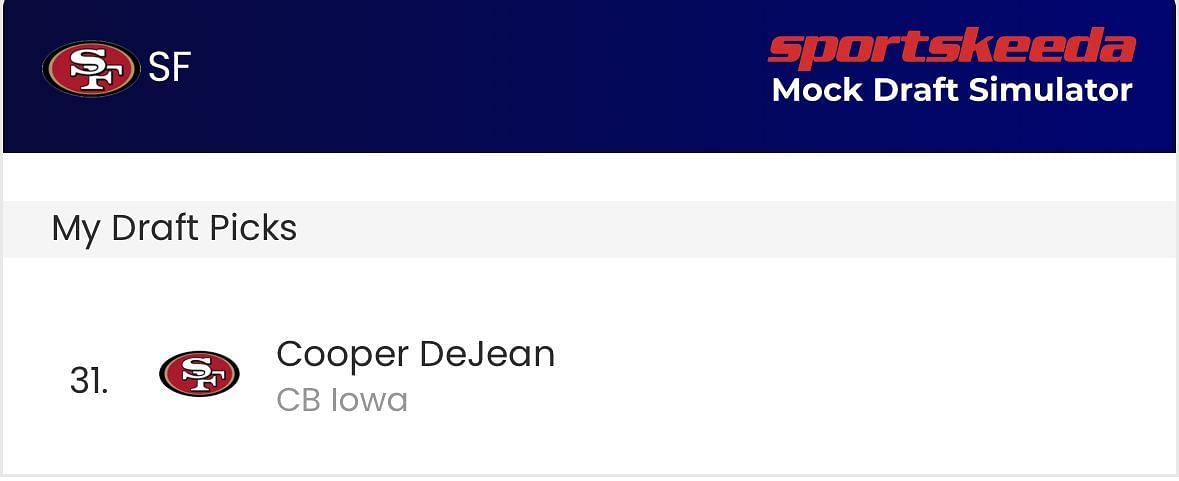 In Sportskeeda's 2024 NFL Mock Draft Simulator, the San Francisco 49ers select the best player available and one of the best defensive players in the draft in Iowa CB, Cooper DeJean.