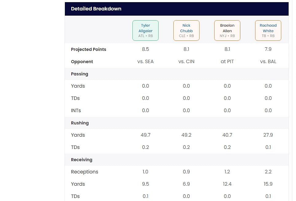 Chubb and White have previously been elite fantasy football running backs, while Allen is one of the most promising rookie prospects. Allgeier has superior projections to all of them in Week 7. He is expected to record the most rushing yards of the group, while also being among the most likely to score a touchdown.