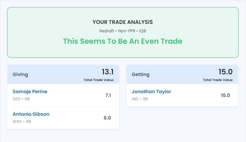 Finally, trading Samaje Perine and Antonio Gibson for Taylor will also work. Their combined values as backups to Javonte Williams and Brian Robinson Jr. compensate for Taylor’s trade value.
