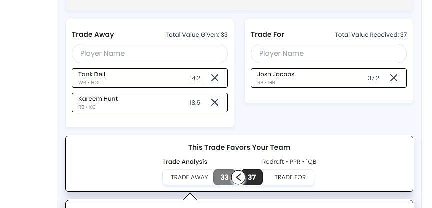 Sportskeeda's Fantasy Football Trade Analyzer suggests trading away a package of Tank Dell and Kareem Hunt in exchange for acquiring Jacobs. Dell and Hunt may decline in the coming weeks due to Nico Collins and Isiah Pacheco nearing returns from injuries, so Jacobs' fantasy outlook is more reliable.