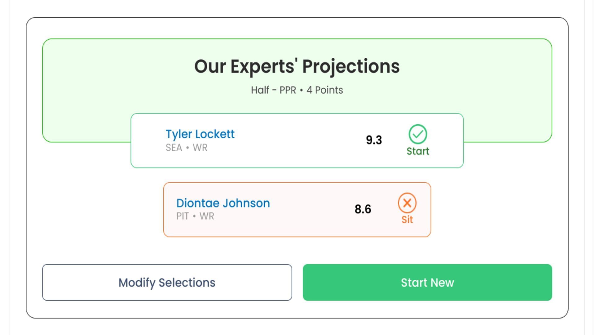 Both wide receivers drive a hard bargain, but the nod goes to Tyler Lockett, according to Sportskeeda's Start/Sit Optimizer. Lockett is projected to beat out Diontae Johnson by 9.3 points to 8.6 points. Johnson is projected to earn 57 yards and five catches in the contest against the Cincinnati Bengals. Meanwhile, Lockett is set to earn roughly four catches for 48 yards.
