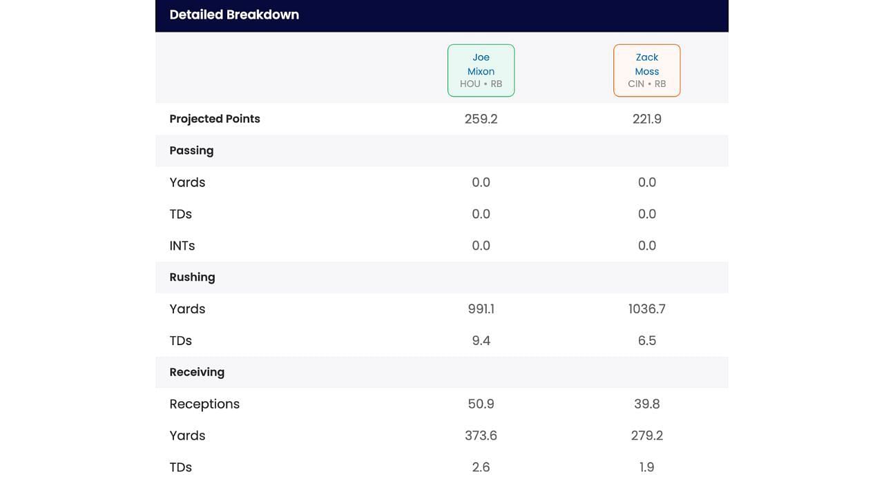 However, if it comes down to those two players, our fantasy analyzer believes Mixon will be the more rewarding pick. It predicts a fairly substantial gap in their season point totals this year. Nevertheless, this is a good range for Moss to be picked in.