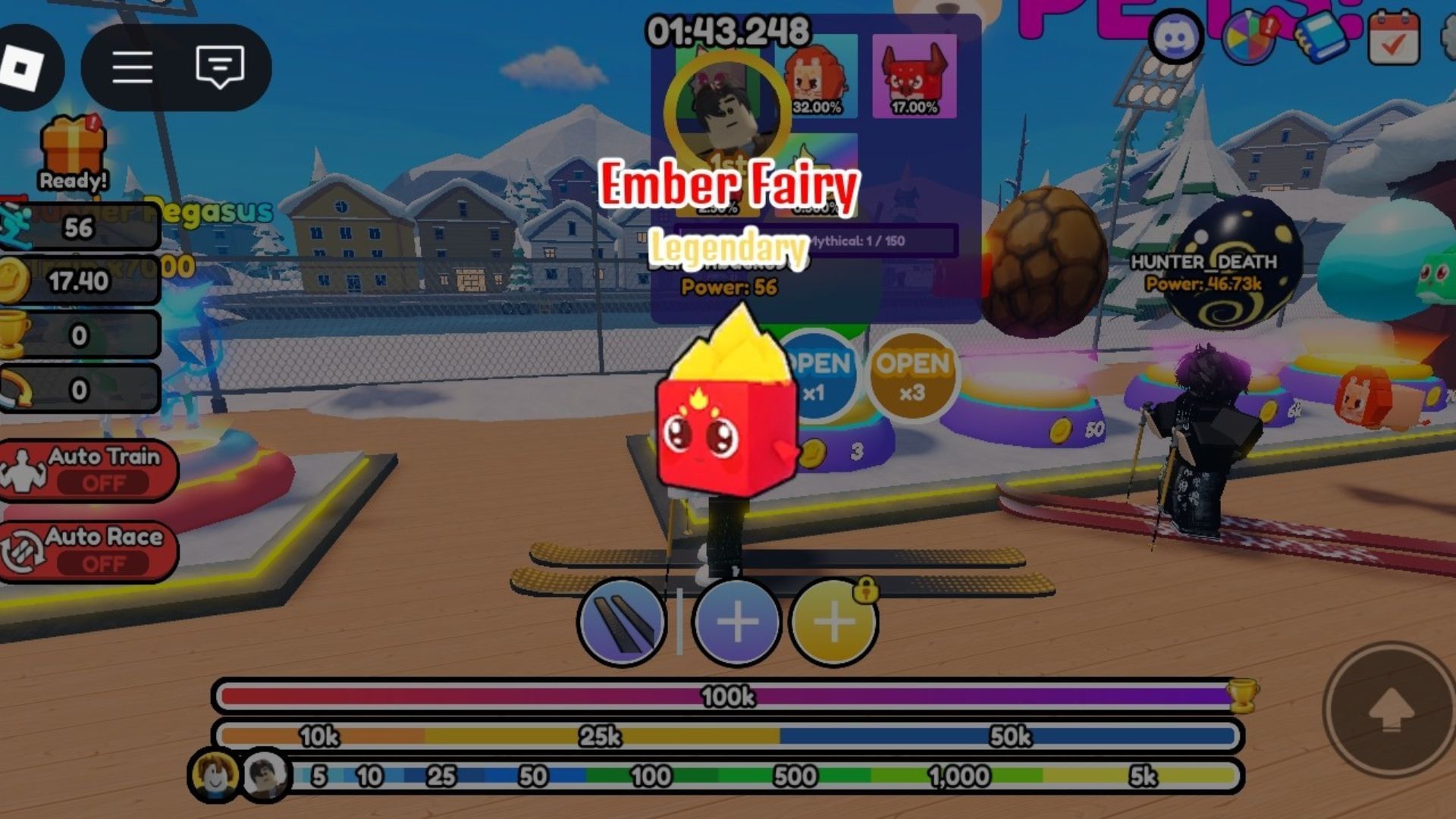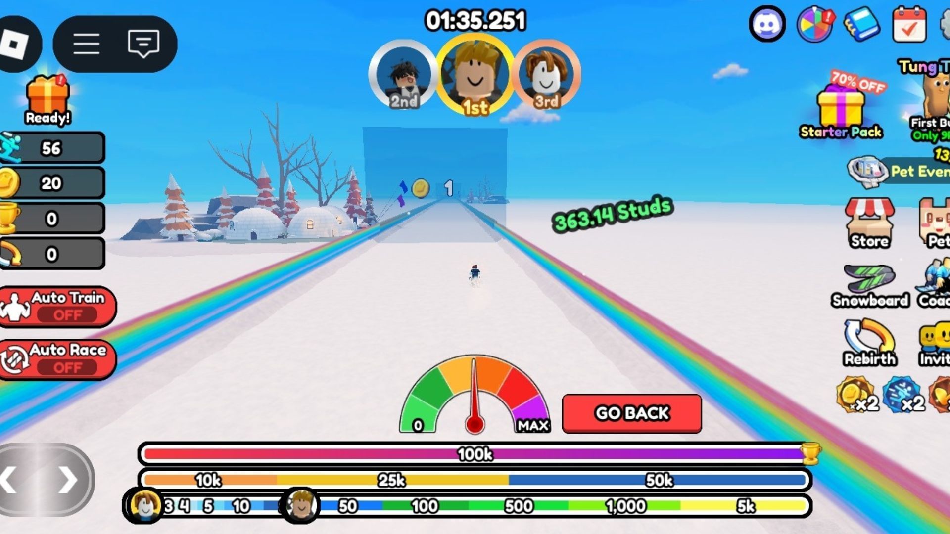 Snow Racing is a skiing and snowboarding tycoon simulator where you gain training points and snowboard down the track for as long as possible. This Roblox game offers upgrades such as pets, coaches, rebirths, and training machines. You race against others and earn coins by clearing checkpoints. These coins can then be spent on further upgrades.