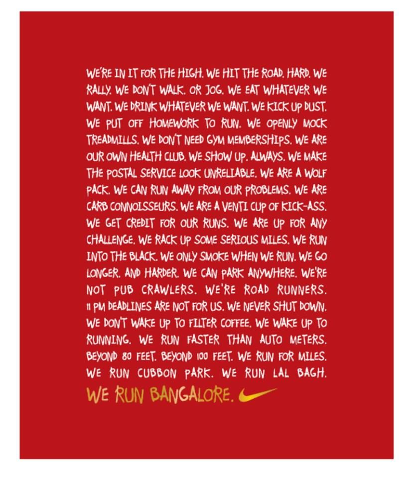My favourite part though is the customised message which has been created especially for the Bangalore runners and which would echo through the psyche of all of them – whether beginner or elite – lighting a fire which puts a spring in their stride.