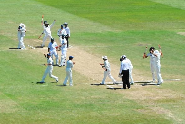 However, when Ishant fell, India still required 11 runs and only Pragyan Ojha left to bat. The two Hyderabadi batsmen batted assuredly despite some hesitations and when Ojha tucked one on his pads for 2 leg-byes, an extraordinary win was achieved.