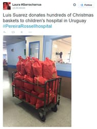 The parcels are said to contain traditional Christmas food and drinks. Suarez, who is an ambassador for Children's cancer charity in Uruguay, is said to have wanted to keep this donation a secret, but despite his best attempts it has leaked out to the public.
