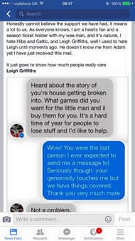 Hearts fan Shane Wright found himself in the unwanted position of having his Christmas presents, which included PlayStation games, robbed just a week from Christmas. His father took to Facebook to lament about this cruel act, which somehow reached Griffiths and moved him enough to contact the father with an offer to replace the gifts.