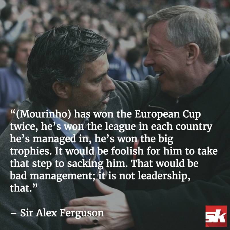 Formal Manchester United manager, Sir Alex Ferguson, has always had a soft spot for the Portuguese. Here's the quote that best describes their relationship. Context: Mourinho was going through a slump at Chelsea. Few months later, he would be sacked.