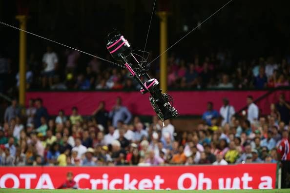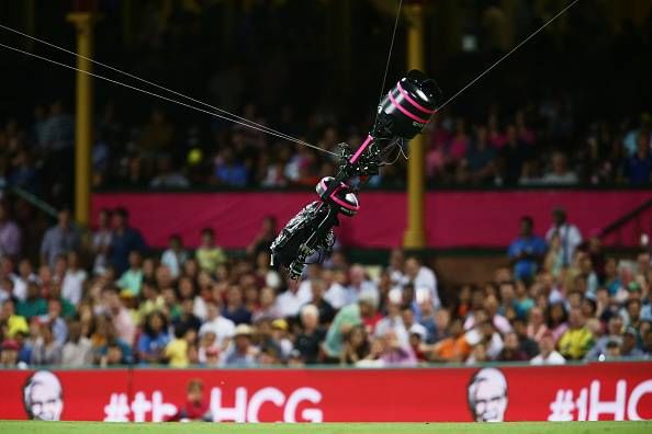 Spidercam was seen skewed after it hit the outfield during the International Twenty20 match between Australia and India at Sydney Cricket Ground today in Sydney, Australia.