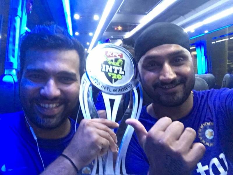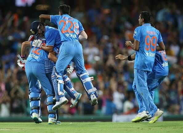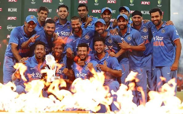The Indian team celebrate with the series trophy after victory in the final Twenty20 international at Sydney Cricket Ground today. A moment to remember for the young team India.