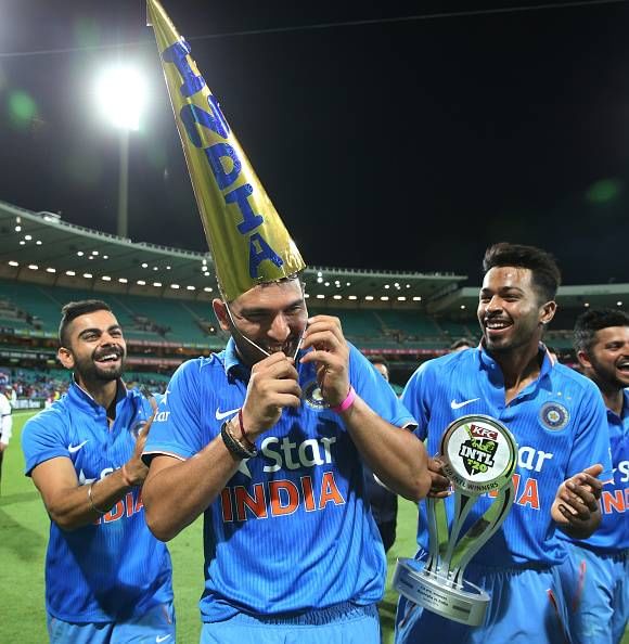 Yuvraj Singh wears an Indian hat after the victory celebration was over. The all-rounder helped India in whatever way possible during the 3-match Twenty20 international series.