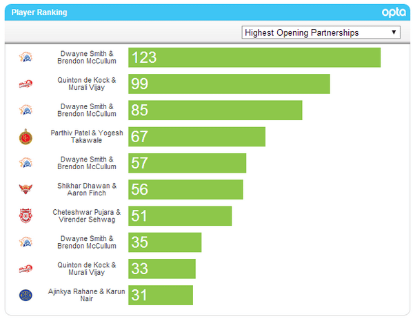 CSK's new opening pair of Brendon McCullum and Dwayne Smith have brought in a new lease of life to the franchise with their attacking batting at the top. This could be the final piece in the jigsaw for the Super Kings. The pair has scored 433 runs between them in Chennai's first 5 matches. They feature in 4 of this season's 8 highest partnerships and will be key to CSK's fortunes. If they get going, DD's bowling attack may be in a spot of bother.