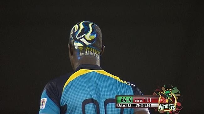 Given a chance to bowl, Sammy took off his trademark floppy hat to reveal his team, St. Lucia Zouks’, logo on the back of his head. The emblem, a phalanx of white, yellow and blue, was meticulously painted on his head, glitter and all.
