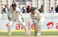 Australia were struggling at 206/5 on the 65th over with debutant Moises Henriques partnering Clarke at the crease. The second delivery of Ravichandran Ashwin’s over witnessed the Australian getting an inside edge onto the pads, which then bobbed up to Cheteshwar Pujara at short leg.