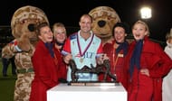 Andrew Strauss, the victorious captain of the Help for Heroes team, celebrates with the trophy.