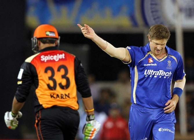 Captain of Rajasthan Royals, Shane Watson claimed his hat-trick against SRH and was the second hat-trick of the season from RR after Pravin Tambe’s. Watson bowled the 4th over of the innings and took Shikhar Dhawan’s wicket of the last ball. He came in to bowl the 17th over directly and dismissed Moises Henriques and Karn Sharma, claiming his very “technical” hat-trick. He finished with his IPL career best figures of 3/13 but in vein as RR couldn’t chase a score of 135 and were bowled out for 102.