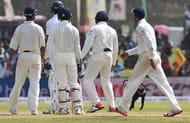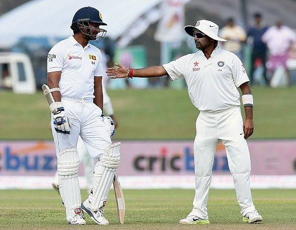 Amit Mishra takes the opportunity of a break in play to say a few words to retiring Sri Lankan legend Kumar Sangakkara.